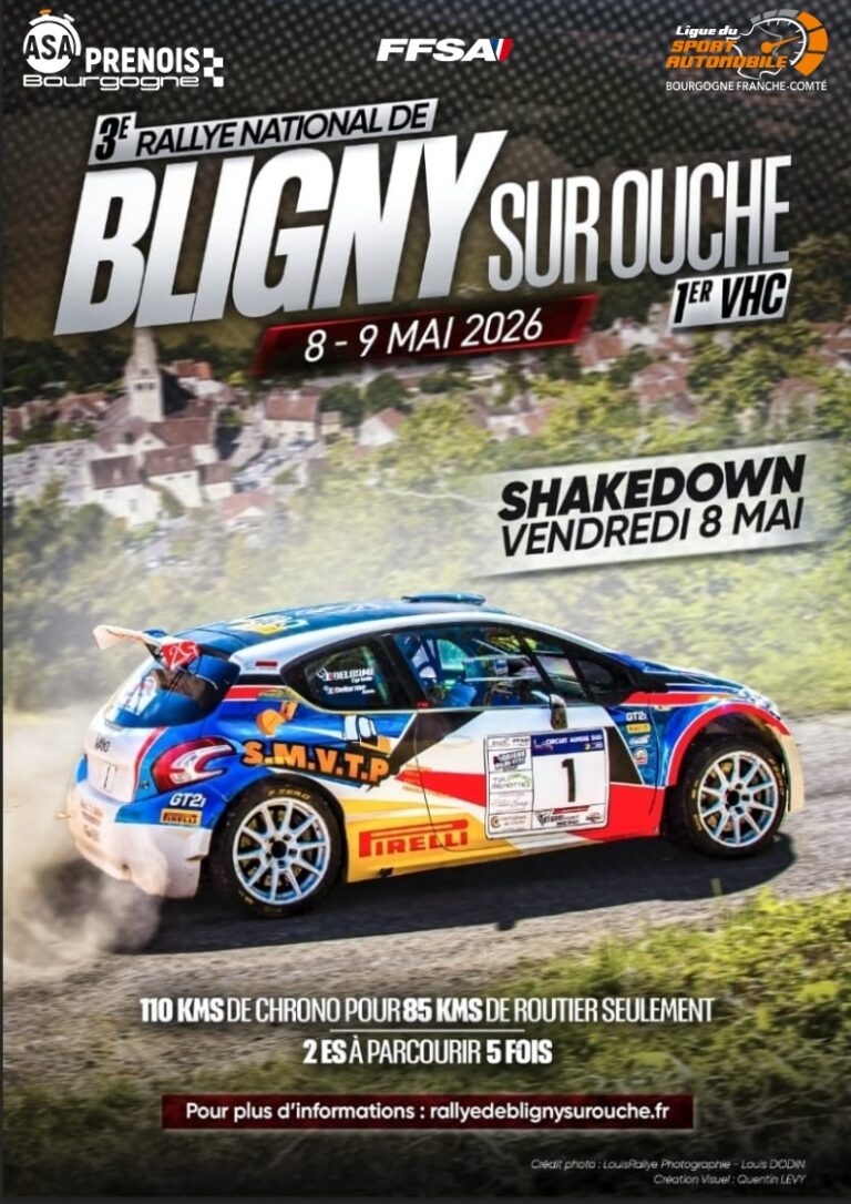 1er VHC + 3ème Rallye National de BLIGNY SUR OUCHE 8 & 9 Mai 2026 "UN RALLYE POUR LES EQUIPAGES, ORGANISE PAR DES EQUIPAGES." Le Rallye de Bligny sur Ouche, c’est …1 shakedown le vendredi2 ES à parcourir 5 fois110km de chrono pour 90km de routier seulementRendez-vous les 8 et 9 mai 2026 dans la belle région de Bligny sur Ouche (située à moins de 50minutes de Dijon et à 20minutes de Beaune).Nous vous attendons nombreux, et bon rallye à tous !!! Dernières Infos Amis Commissaires, pensez à vous inscrire au plus vite.Merci 😉Concurrents, nous vous attendons en nombre. CommissairesInfo Commissaires ConcurrentsRéglement, Engagement SpectateursCartes, Timing Presse / CommissaireAccréditation, Info Commissaire
